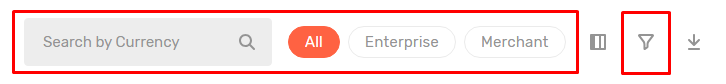 Click the funnel icon to open a filter popup and enter desired values. Filters vary by page and can include text, number, date, selector, etc. Click Apply to enable filtering and Reset to disable it.