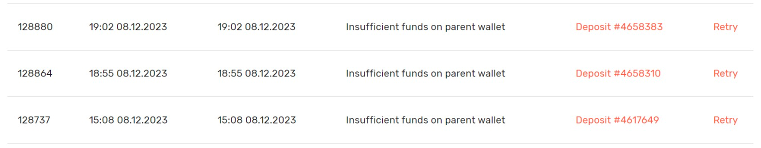 • If the parent wallet has sufficient funds, click on the "Retry" button next to each unconfirmed transaction. This action will attempt to process and confirm those transactions.